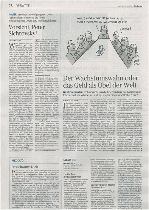 Und da schau her, die Presse hat den Artikel tatsächlich sowohl in der Online Ausgabe freigegeben, sondern auch auf Seite 28 in der Ausgabe vom Freitag den 10. Juni 2022 abgedruckt.
